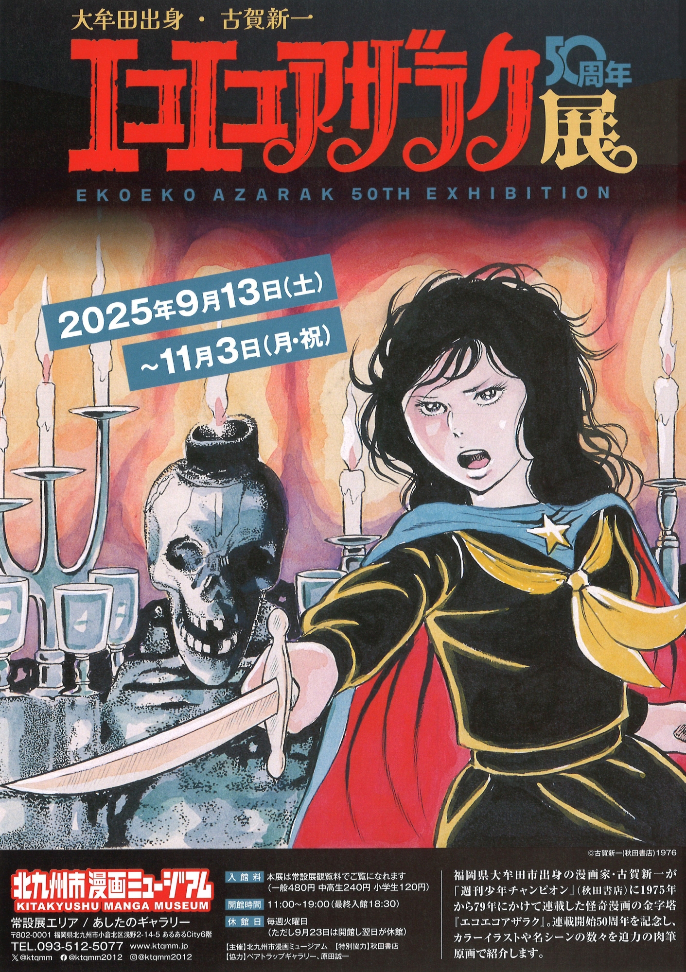 本展では、『エコエコアザラク』連載開始50周年を記念し、カラーイラストや名シーンの数々を、合計140点に及ぶ迫力の肉筆原画で紹介します。恐怖を掻き立てる緻密な筆致、鬼気迫る悪魔的な“儀式”の描写、西洋の宗教画や幻想画をオマージュした印象的な扉絵などを、ぜひ間近でお楽しみください。<北九州市漫画ミュージアム公式サイトより>