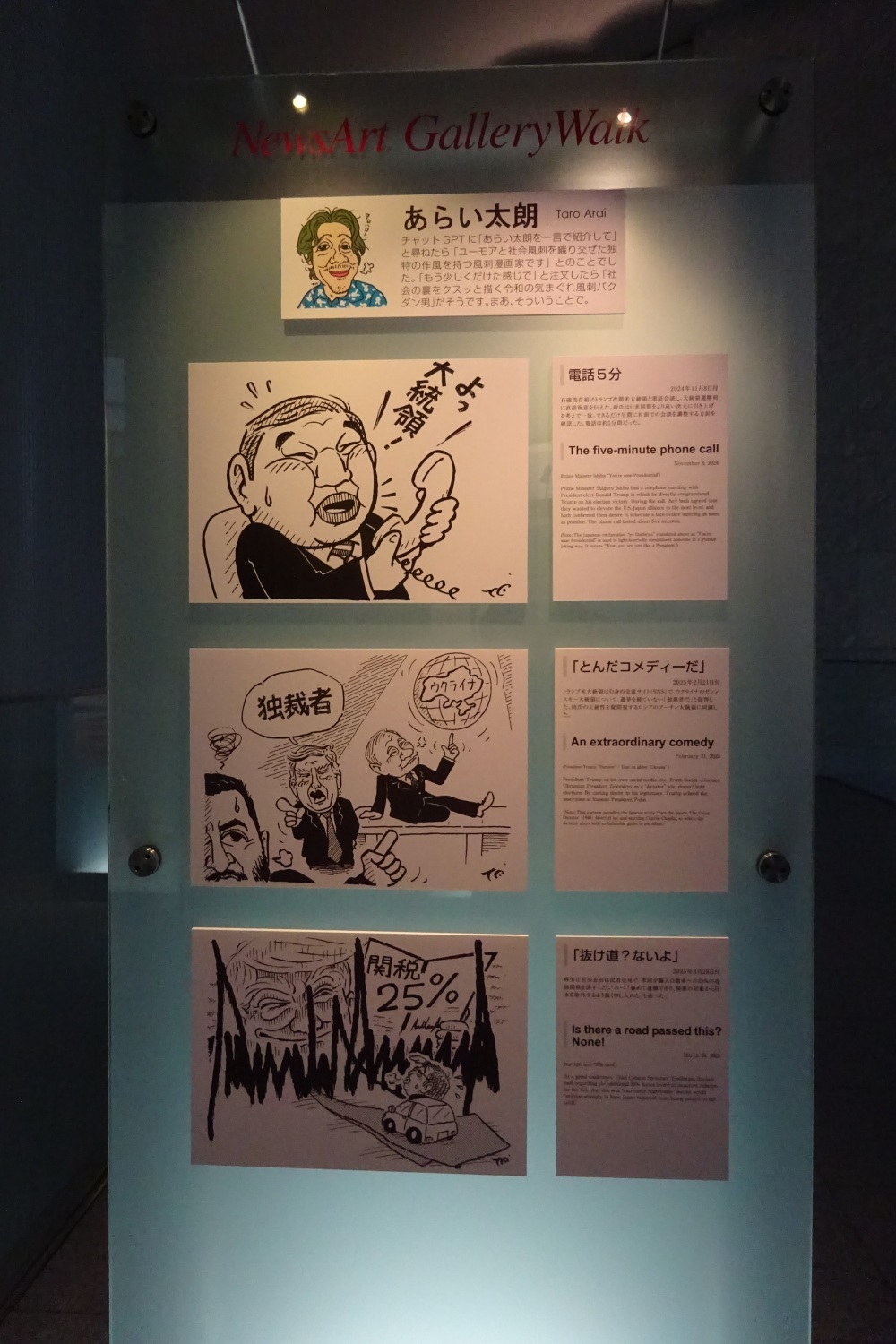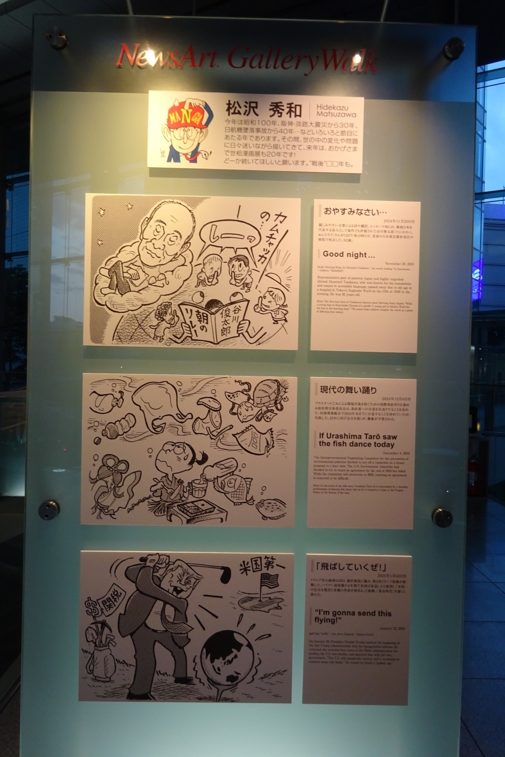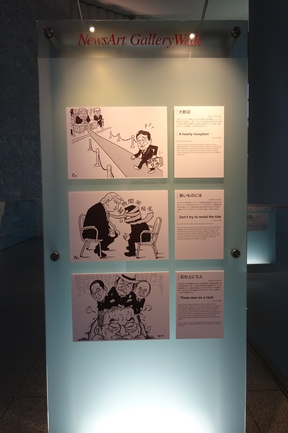 特に取材へ伺った日の「今日の世相漫画」は、トランプ米首相が来日していた時の一コマで、個人的にうーん!と膝を打つような1枚でした。