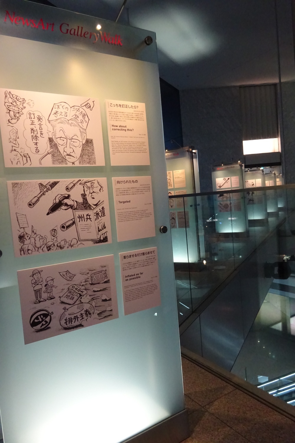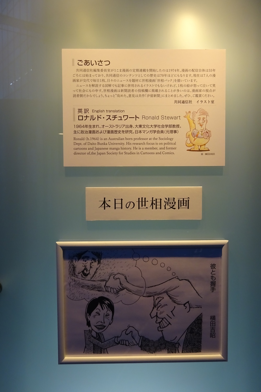 これは、共同通信社から日替わりで担当する7名の作家により1年間発信され続けた一コマまんがたちから選りすぐった数点を選び出し展示されたもので、今年は世界的に良くも悪くも政局が大きく変わった1年であったためか、クスリと笑うものはもちろん、思わず唸らされてしまう傑作まで、とても見応えのある展示となっていました。