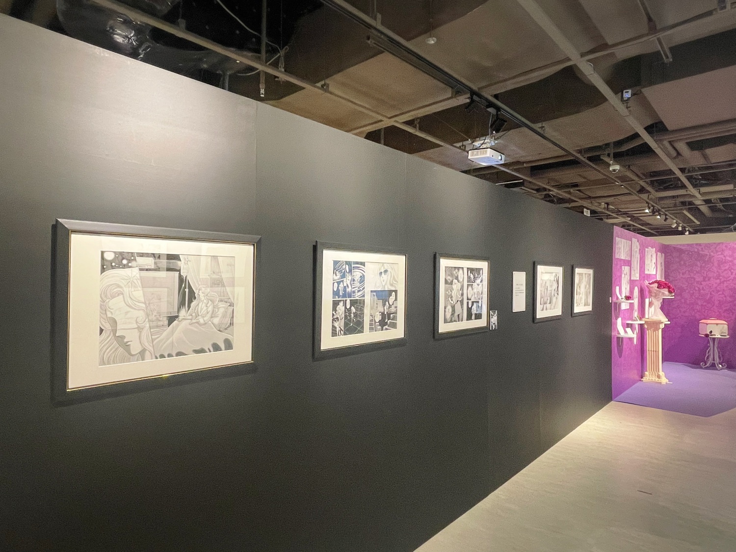 展示されている原画総数は323点。繊細な線、ホワイトで入れられた煌めき、ベタの質感、本物の原画でしか体験出来ない貴重な空間が広がっています。