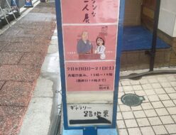 2.16安倍夜郎・小河原智子「キケンな二人展」開催中!2月8日から21日まで、銀座のギャラリー路地裏にて安倍夜郎氏と小河原智子氏の「キケンな二人展」が開催されている。会場内、安倍氏の四コマ漫画が入り口近くに展示され、まず目を引く。来場したお客様もじっくり読んでいる。小河原氏の似顔絵が華やかな色彩で数多く展示され、時事ネタ等こちらにも目が釘付けになる。